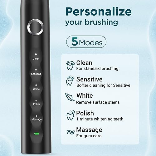 5 High-PERFORMANCE MODES- Sonic electric toothbrush has 5 modes. Clean: For daily cleaning; Sensitive: Softer cleaning for sensitive; Whitening: Remove surface stains; Polishing: 1-minute whitening teeth; Massage: For gum care. To accommodate different teeth and gum conditions for different cleaning and care needs.