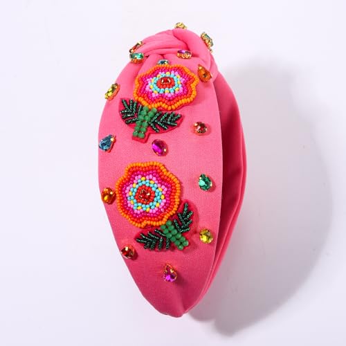 mokkia Summer Headband for Women Beaded Flower Headband Crystal Rhinestone Jeweled Knotted Headband Boho White Pink Wide Top Knot Headband Summer Beach Hair Accessories Gifts (Flower A)
